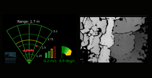 Fornece alcance para estrutura em metros, uma interface semelhante a um sonar que ilustra o alcance de cima para baixo para a estrutura e uma zona amarela “Goldilocks” que pode ser ajustada com base na distância de afastamento desejada para o escopo do trabalho.